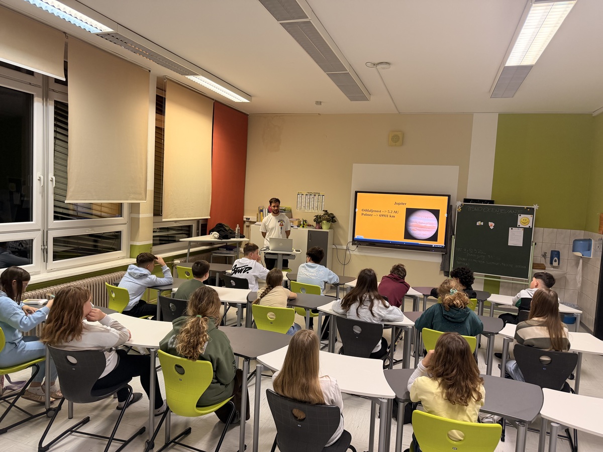 Na naši šoli smo v četrtek, 12. 3. 2026, pripravili zanimiv astronomski večer, ki je učence popeljal v svet planetov, zvezd in oddaljenih nebesnih teles. Večer se je začel z predavanjem člana Astronomskega društva Kmica, ki je učencem predstavil planete našega Osončja ter razkril nekaj zanimivosti o vesolju.